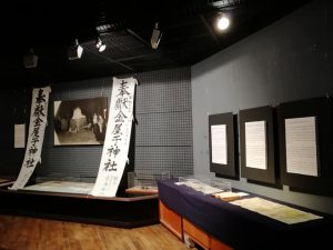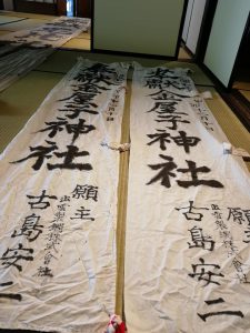 今月16日より、鉄の未来科学館で始まりました企画展「第二次世界大戦とたたら製鉄 出雲製鋼株式会社」。現在、展示スペースには金屋子神社の祭礼に掲げた幟が展示されています。願主は出雲製鋼株式会社社長・古島安二氏。幟に記された日付は昭和14年(1939)12月10日。