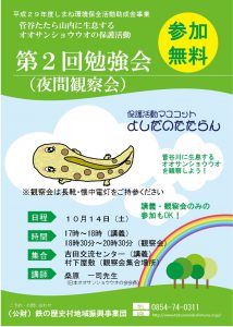 平成29年度しまね環境保全活動助成金事業としておこなっております菅谷たたら山内に生息するオオサンショウウオの保護活動の続報です!先日ご報告した第1回勉強会に引き続き、第2回勉強会を来月14日に実施いたします。参加は無料!講義、勉強会どちらかのみの参加もできますよ。ぜひご参加ください!