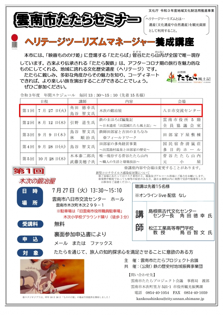 問合せ先:雲南市たたらプロジェクト会議事務局 渡部さん