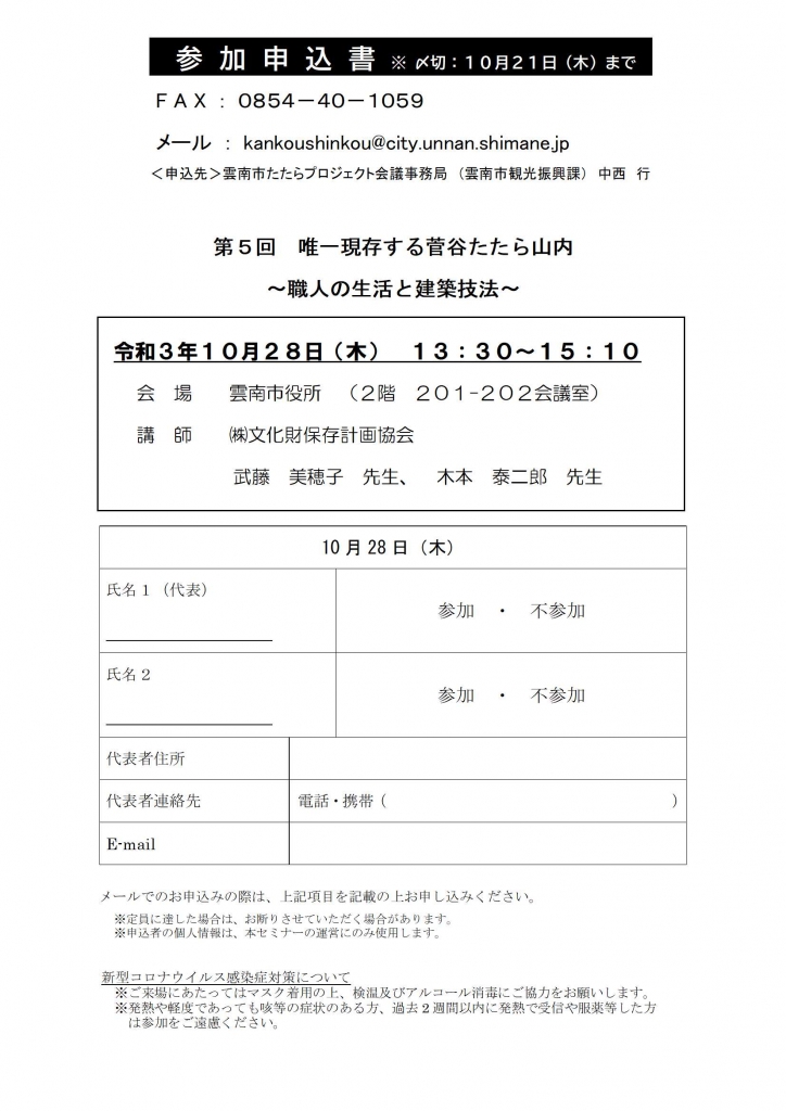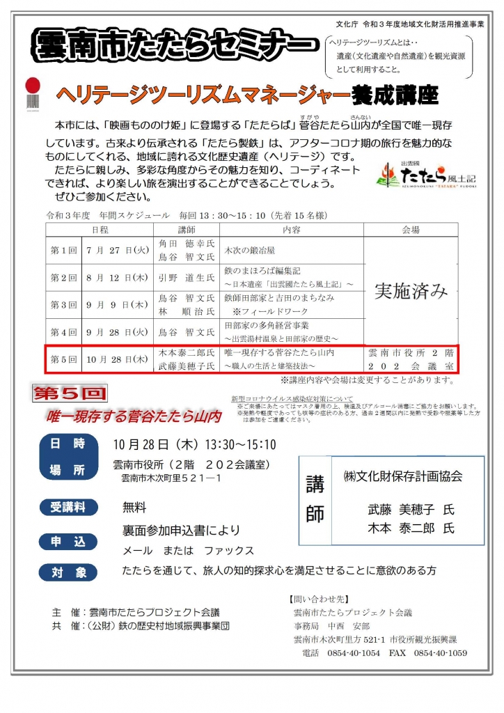 第5回ヘリテージツーリズムマネージャー養成講座について 2021 10/13 イベント情報 最新情報 2021年10月13日 第5回目を下記のとおり開催します。 日時 : 10月28日(木)13:30~15:10 場所 : 雲南市役所2階 202会議室 受講料: 無料 申込み: 申込書、メール、ファックス 問合せ先:雲南市たたらプロジェクト会議事務局 中西さん・安部さん 電話0854-40-1054 FAX0854-40-1059 共有: クリックして X で共有 (新しいウィンドウで開きます) X Facebook で共有するにはクリックしてください (新しいウィンドウで開きます) Facebook 関連 イベント情報 最新情報 よかったらシェアしてね! URLをコピーしました! URLをコピーしました! 10月の休館日 11月の休館日 この記事を書いた人 zaitetsu 関連記事 1月の休館日 2021年12月25日 12月の休館日 2021年11月25日 鉄の歴史村フォーラム2021 第2回菅谷たたら山内総合文化調査報告会 2021年11月17日 11月の休館日 2021年10月28日 10月の休館日 2021年10月1日 写真展「たたらの里・吉田の秋」 2021年9月19日 第4回ヘリテージツーリズムマネージャー養成講座について 2021年9月17日 9月の休館日 2021年8月24日
