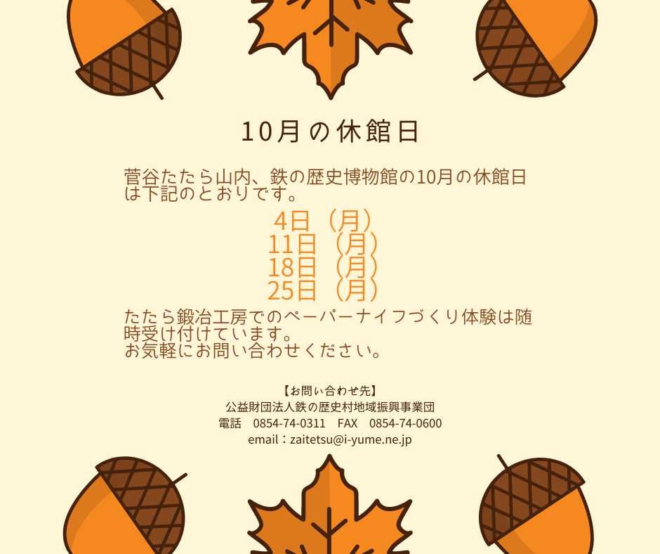 10月の休館日 2021 10/01 イベント情報 最新情報 2021年10月1日 共有: クリックして X で共有 (新しいウィンドウで開きます) X Facebook で共有するにはクリックしてください (新しいウィンドウで開きます) Facebook 関連 イベント情報 最新情報 よかったらシェアしてね! URLをコピーしました! URLをコピーしました! 写真展「たたらの里・吉田の秋」 第5回ヘリテージツーリズムマネージャー養成講座について この記事を書いた人 zaitetsu 関連記事 1月の休館日 2021年12月25日 12月の休館日 2021年11月25日 鉄の歴史村フォーラム2021 第2回菅谷たたら山内総合文化調査報告会 2021年11月17日 11月の休館日 2021年10月28日 第5回ヘリテージツーリズムマネージャー養成講座について 2021年10月13日 写真展「たたらの里・吉田の秋」 2021年9月19日 第4回ヘリテージツーリズムマネージャー養成講座について 2021年9月17日 9月の休館日 2021年8月24日