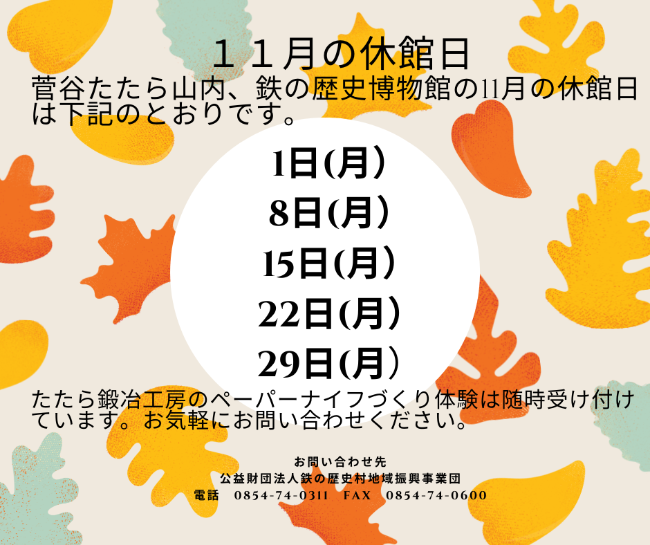 11月の休館日 2021 10/28 イベント情報 最新情報 2021年10月28日 共有: クリックして X で共有 (新しいウィンドウで開きます) X Facebook で共有するにはクリックしてください (新しいウィンドウで開きます) Facebook 関連 イベント情報 最新情報 よかったらシェアしてね! URLをコピーしました! URLをコピーしました! 第5回ヘリテージツーリズムマネージャー養成講座について 鉄の歴史村フォーラム2021 第2回菅谷たたら山内総合文化調査報告会 この記事を書いた人 zaitetsu 関連記事 1月の休館日 2021年12月25日 12月の休館日 2021年11月25日 鉄の歴史村フォーラム2021 第2回菅谷たたら山内総合文化調査報告会 2021年11月17日 第5回ヘリテージツーリズムマネージャー養成講座について 2021年10月13日 10月の休館日 2021年10月1日 写真展「たたらの里・吉田の秋」 2021年9月19日 第4回ヘリテージツーリズムマネージャー養成講座について 2021年9月17日 9月の休館日 2021年8月24日