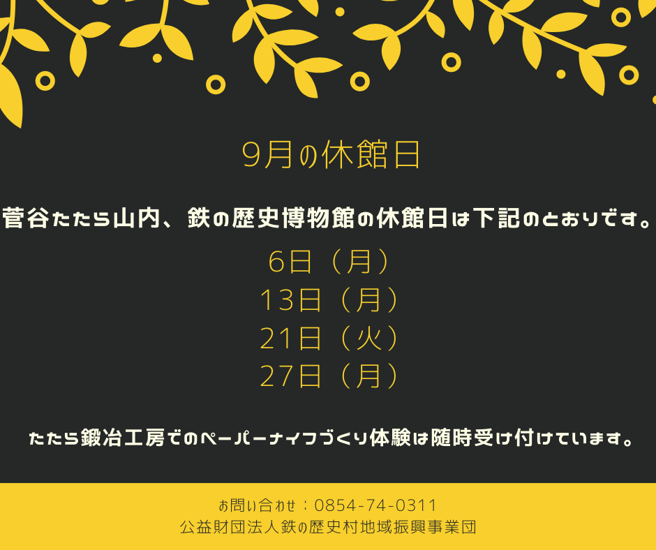 9月の休館日 2021 8/24 イベント情報 最新情報 2021年8月24日 共有: クリックして X で共有 (新しいウィンドウで開きます) X Facebook で共有するにはクリックしてください (新しいウィンドウで開きます) Facebook 関連 イベント情報 最新情報 よかったらシェアしてね! URLをコピーしました! URLをコピーしました! 鉄の歴史博物館2号館の屋根の吹替工事について 第4回ヘリテージツーリズムマネージャー養成講座について この記事を書いた人 zaitetsu 関連記事 1月の休館日 2021年12月25日 12月の休館日 2021年11月25日 鉄の歴史村フォーラム2021 第2回菅谷たたら山内総合文化調査報告会 2021年11月17日 11月の休館日 2021年10月28日 第5回ヘリテージツーリズムマネージャー養成講座について 2021年10月13日 10月の休館日 2021年10月1日 写真展「たたらの里・吉田の秋」 2021年9月19日 第4回ヘリテージツーリズムマネージャー養成講座について 2021年9月17日