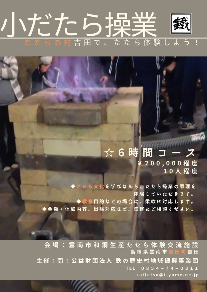 耐火レンガで炉をつくり、木炭と砂鉄を原料に、約6時間の小規模たたら操業が体験できます。